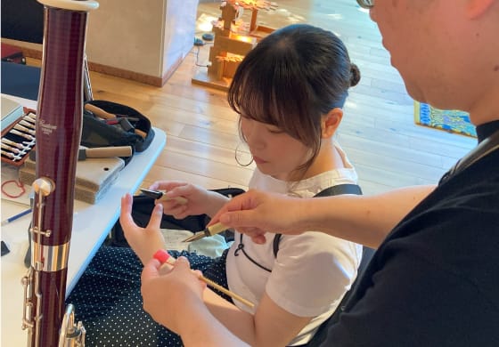 また、ファゴットに欠かせない「リード」制作のためのスペースも設けられ、久住先生の専門的なアドバイスを受けながら、ミリ単位での細やかな調整に挑戦しました。